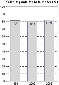 ![]() Valresultat och det svenska valsystemet Geografiskt mönster: Det socialistiska blocket har starkast stöd i norra Sverige medan det borgerliga blocket dominerar i söder. Den bakomliggande skuggningen visar skillnader i valdeltagande mellan olika valkretsar. Jämför med valdeltagandet för hela riket under perioden 1998 - 2006 (diagram):