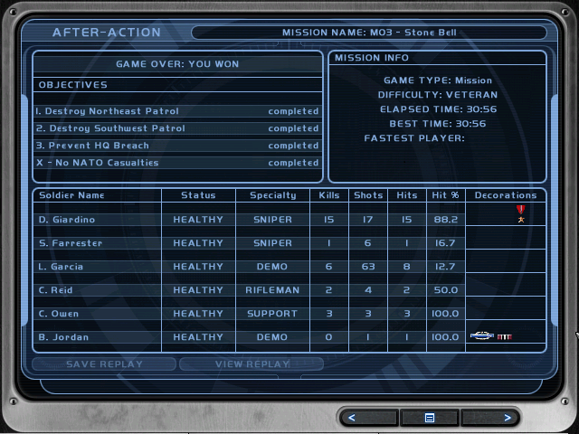 Hur man lyckas med ett spel: 1. Ha ingen musik, bara spelets ljud. 2. Ha nattbanor. 3. Sniper som enda vapen. 4. Ha squad commands. 5. �ppna banor. 6. Prim�ra & Sekund�ra objectives.